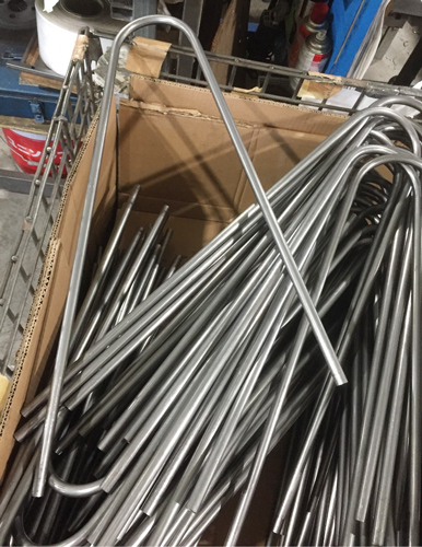 片方を長く片方を短く曲げます。このあとパイプの側面に4ヶ所の貫通穴をあけます。長さを決めるのが難しそうです。これも熟練の技なのでしょう。